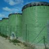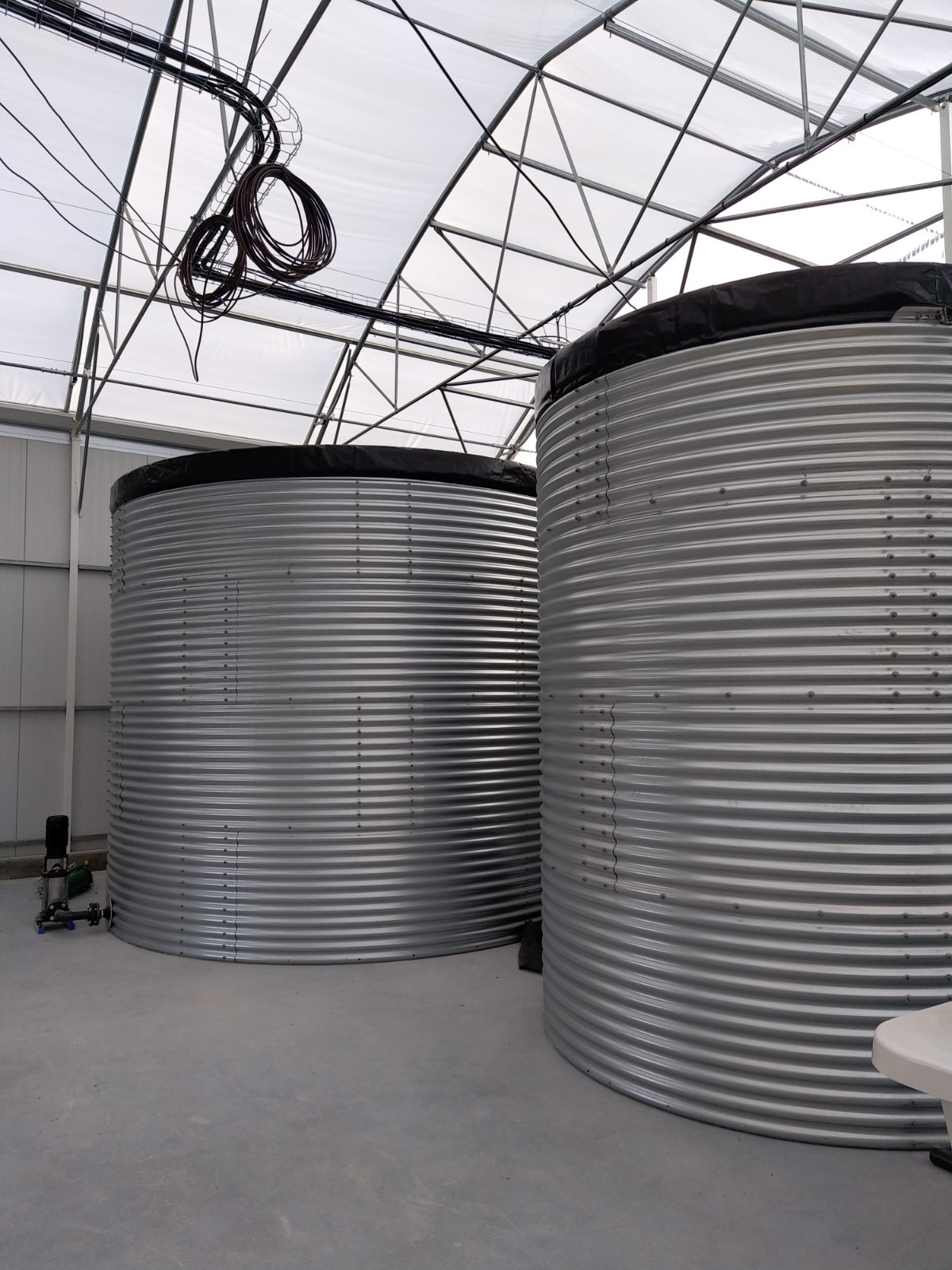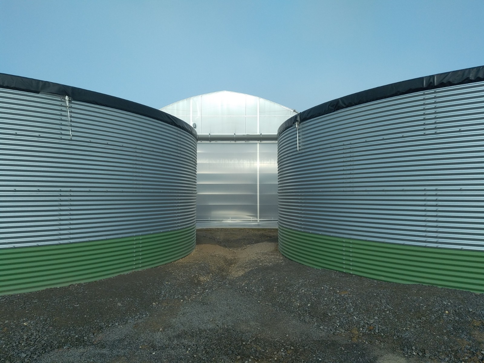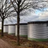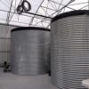 Réserve d’eau en tôles ondulées cintrées en acier, équipée d’un liner.